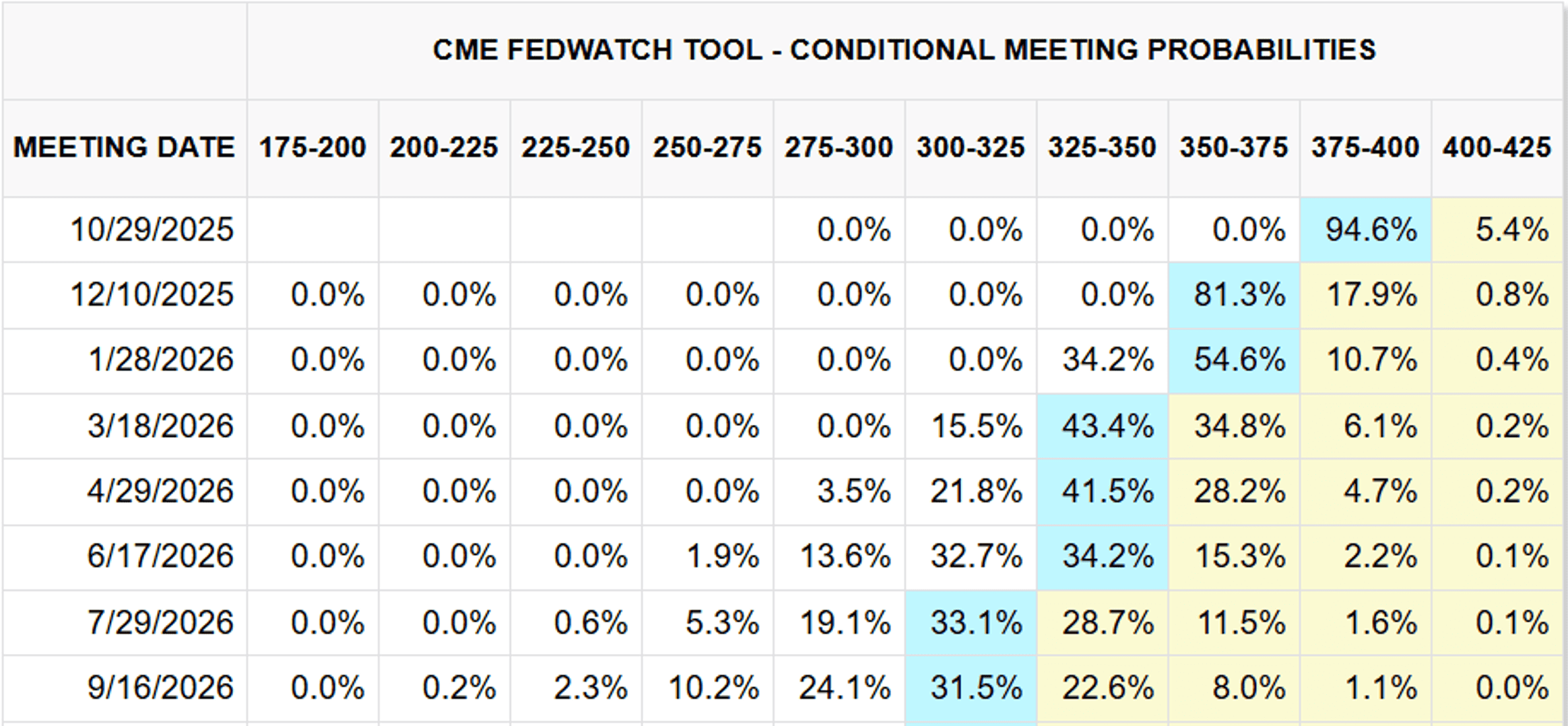 The bond market was fairly quiet this week as the government remains shutdown and most economic data is not being released. For the week, the 2yr yield was unchanged at 3.57% and the 10yr fell 2bp to 4.10%. We have already missed the most important data point of the month, the monthly jobs report, and now we will most likely not get the second most important data point, the Consumer Price Index, on time this coming week. However, since the September CPI is used to calculate cost of living adjustments for next year’s Social Security checks, the BLS has recalled staff to do the necessary calculations in order the release the September CPI before month-end (the data needed for the September CPI was already collected before the shutdown). And hopefully the Fed will have the latest inflation data before the next FOMC meeting on Oct 28-29. The question remains, will the Fed continue cutting rates in the absence of economic data, especially employment and inflation data? New York Fed President John Williams stated in an interview with the New York Times this week that a lapse in official government data would not deter him from wanting to take action at the Fed’s upcoming meetings. He acknowledged that government data were the “gold standard”, but private-sector providers and Fed surveys were also informative. The private payroll firm ADP released their monthly jobs data last week showing private payrolls fell 32,000 in September, the third negative month this year and the largest drop since March 2023. Based on that data alone it would be hard for the Fed to assume anything other than the labor market remains very weak and further rate cuts may be necessary. Markets certainly believe so with fed funds futures currently pricing in a 95% chance the Fed will cut rates 25bp at their meeting this month and an 81% chance they will cut again in December.
