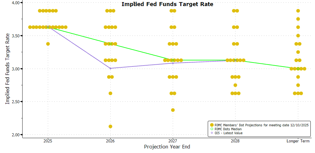 Despite the internal divergence, the Committee does appear to agree on two key facts, 1. inflation is still too high and 2. the labor market has softened with further downside risk. Where the members differ is in how those risks are weighted and what individual forecasts imply going forward. Powell suggested that the Fed is now “well positioned to wait and see” how the economy evolves, a comment that is be widely interpreted to signal a pause in the cutting cycle. The Fed’s updated “dot plot” shows only one 25 bp cut in 2026 with another single cut in 2027, which is unchanged from the Fed’s September projections and notably more hawkish than market pricing. Futures markets are currently pricing in the next rate cut to come in June 2026 with just over two full cuts priced in by the end of 2026.