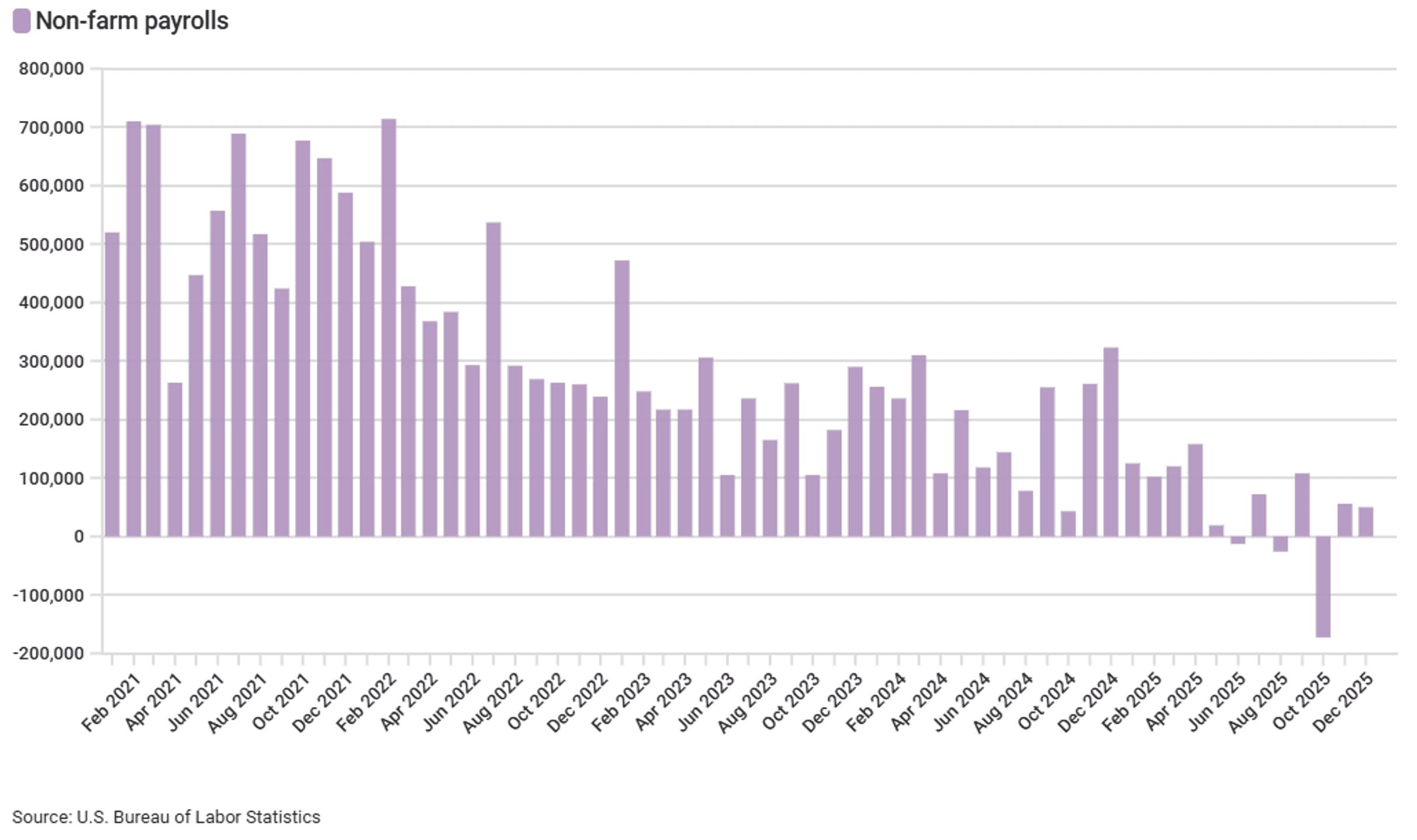 Good morning and Happy Jobs Report Friday! This morning, the Bureau of Labor Statistics released the December jobs report which showed that nonfarm payrolls rose 50,000 (est = 73,000) for the month. Employment in leisure and hospitality increased by 47,000 from November to December, and employment in healthcare increased by 21,000. Employment fell by 25,000 in retail trade and by 11,000 in construction. Revisions were made to the payroll numbers for the prior two months, with October’s report revised down by 68,000 from a loss of 105,000 to a loss of 173,000 jobs, while November’s report was revised down by 8,000 from a gain of 64,000 to 56,000. At the same time, the unemployment rate fell to 4.4%, which was estimated to come in at 4.5%. The decline in the unemployment rate comes after the unemployment rate rose to 4.6% in November, which is the highest it’s been since September 2021. This morning’s jobs report is being seen by some as a “Goldilocks print”. Soft enough to keep rate-cut hopes alive but strong enough to avoid some recession fears.