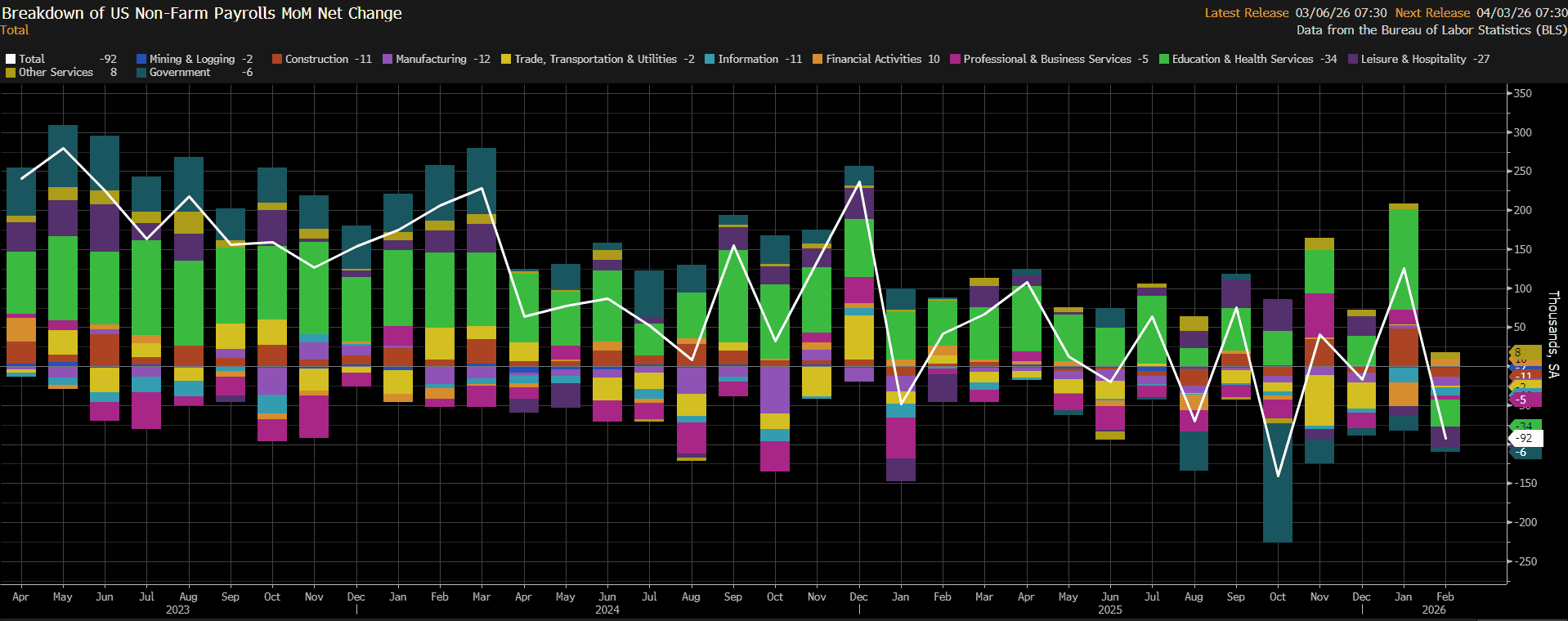 Job growth plunged in February following a strong January, reinforcing concerns labor market deterioration is accelerating. February Non-Farm Payrolls unexpectedly fell by -92k (est = +55k) and the prior two months were revised lower by -69k. Job losses were fairly widespread with the largest declines in leisure & hospitality (-27k), healthcare (-19k), private education (-15k), and manufacturing (-12k) while financial activities (+10k) and other services (+8k) led gains. The BLS said at least some of the February weaknesses were due to strike activity while weather also likely played a role. Nonetheless, this was the largest drop in jobs since October and the 5th monthly decline in the last 12 months. The separate household survey showed a loss of 185k jobs and an increase in the unemployment rate to 4.4% (est = 4.3) as the labor force participation rate unexpectedly plunged to 62.0% (est = 62.5%), the lowest level since December 2021. Although some of the weaknesses in this report will be dismissed due to strikes and weather, it was an unexpectedly bad employment report across the board with widespread job losses, negative revisions, a jump in the unemployment rate, and a decline in participation.