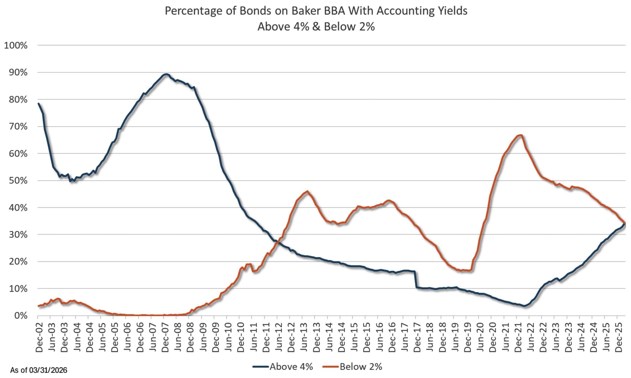 But along with unrealized losses came significantly higher reinvestment opportunities and the same forces that once worked against banks are now working in their favor. Low-yielding bonds have continued to mature while the 2021-23 surge in bond yields opened a window — one that many proactive banks took advantage of aggressively — to purchase bonds at yields that hadn't been available since before the financial crisis. Data from more than 600 community banks on The Baker Group’s Baker Bond Accounting (BBA) system now shows that high-yielding bonds have finally reclaimed the lead, exceeding holdings of low-yielding bonds for the first time in over 13 years.